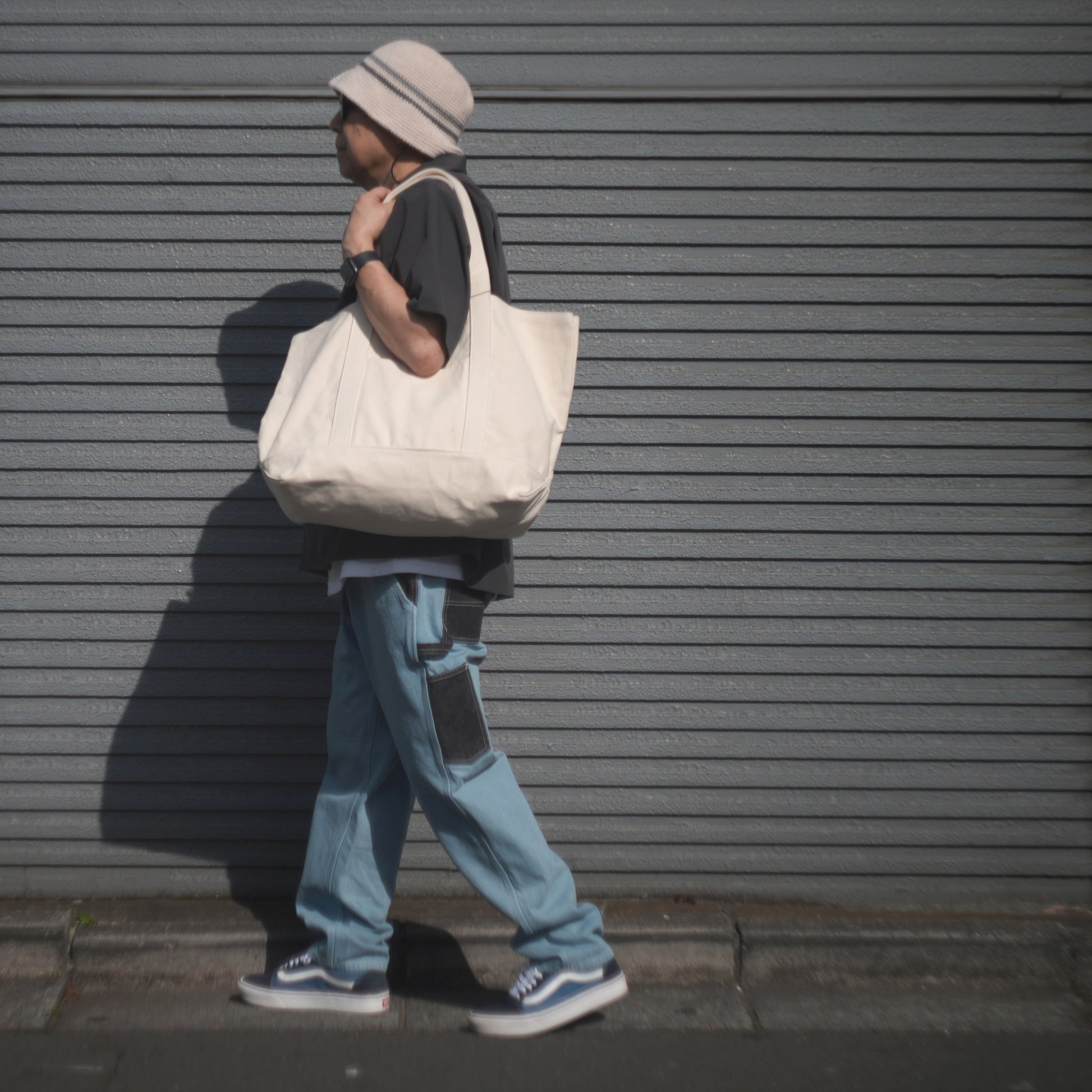 2 tacks + rubber + straps, loose waist and hem taper, unique silhouette and addictive easy pants with outstanding comfort. It's a perfect 9.5 minute length, so you can wear it as it is, roll it up, or socks it in. made in Japan.