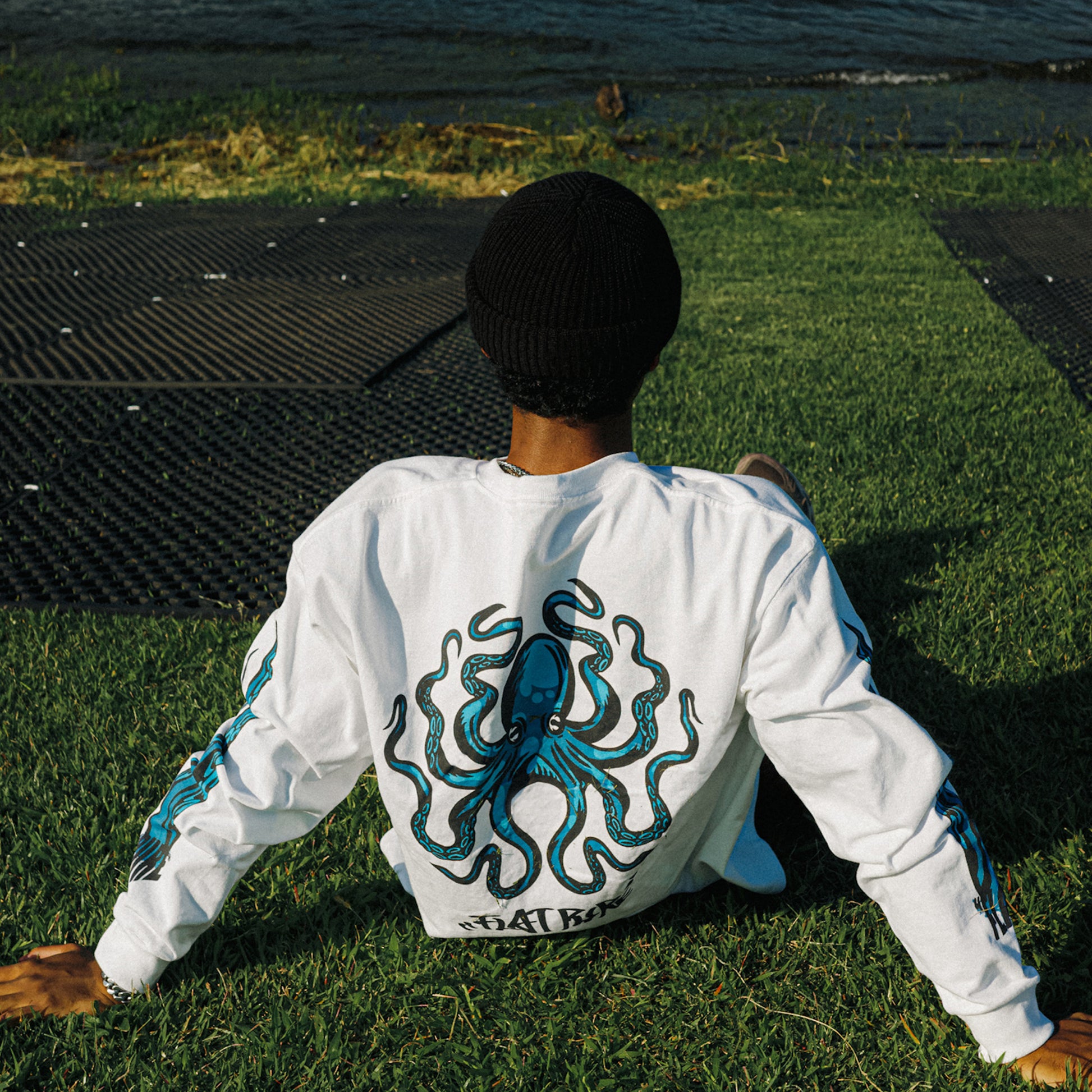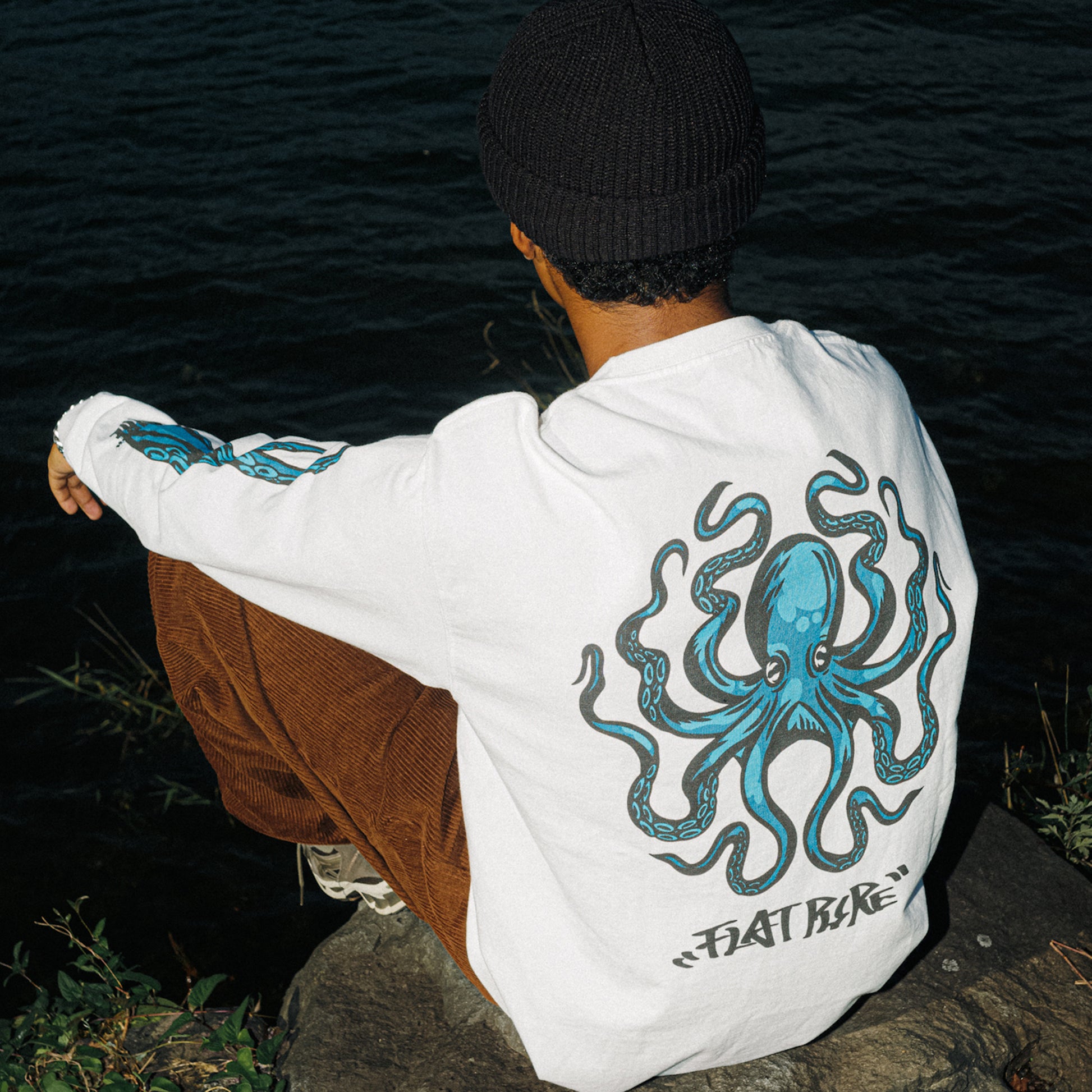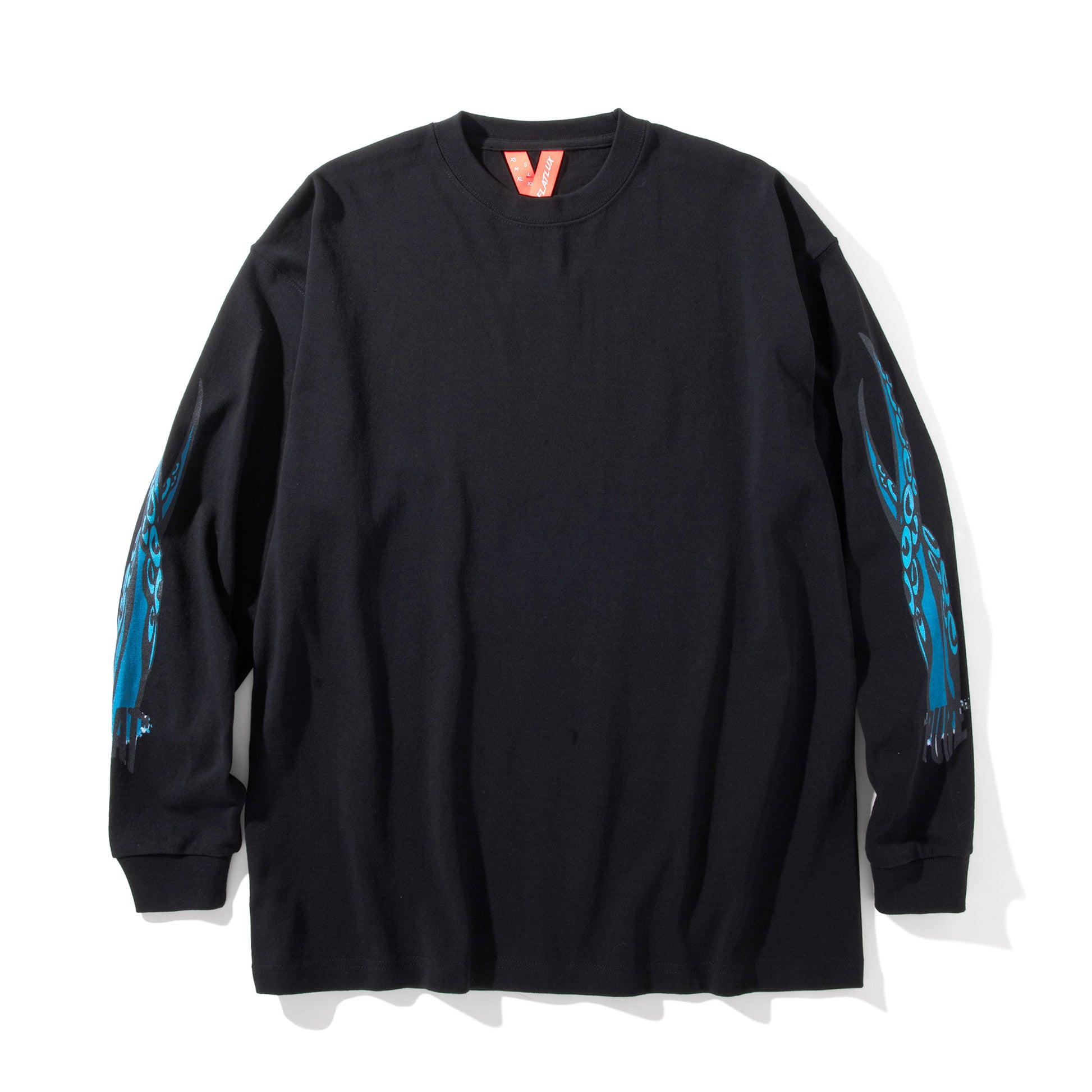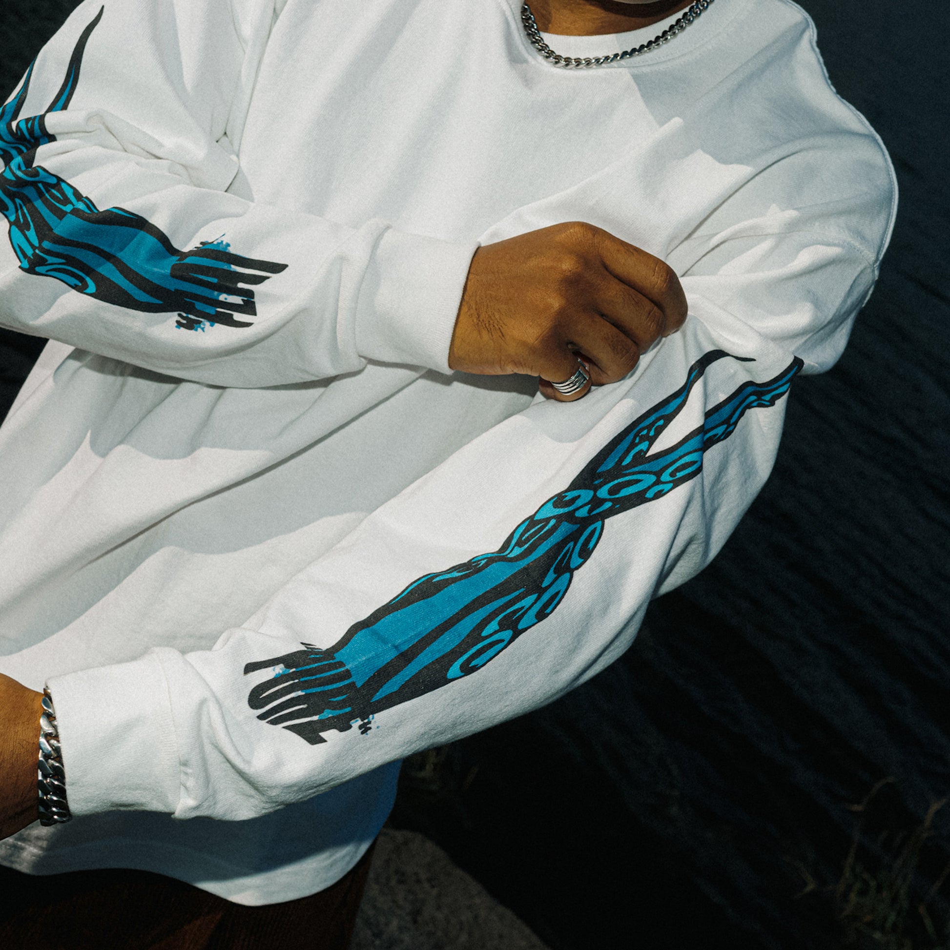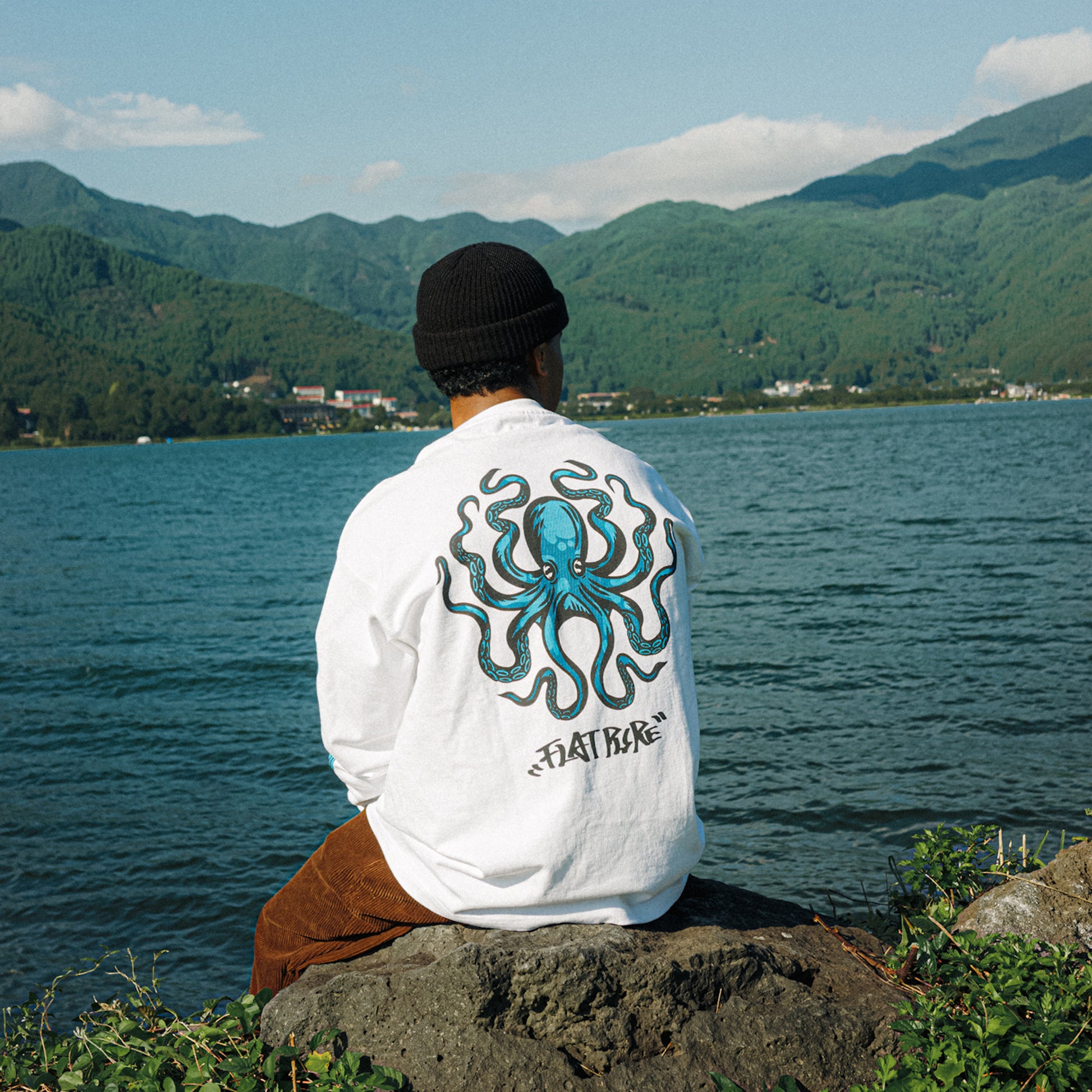 バイク、スノーボード、キャンプ、仲間とチル。自由奔放な生き方とそれが反映された絵が魅力の注目若手グラフィックアーティスト PUREの描き下ろし。彼の絵の特徴である生き物と青。PURE節全開、スタイル全開、アクセル全開です。超絶ヘビーウェイト & ゆったりシルエット。