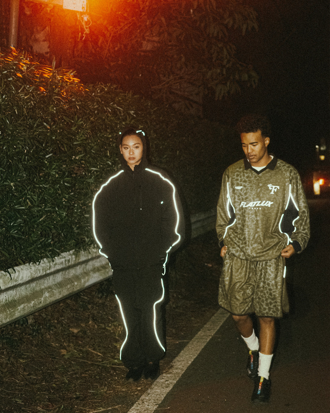Curved Reflective Piping Pant. Water repellent Fabric, Oversized Fit. Trident Jacket made out of the same cloth material.