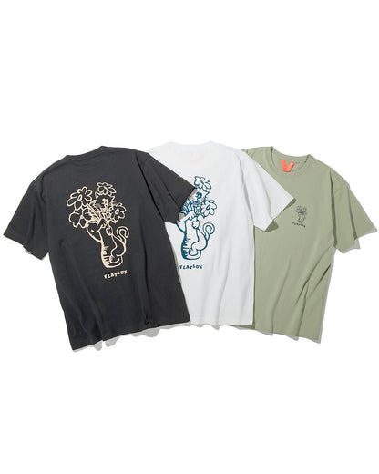 家に花があるだけでなんだかほっこりするよね。家に猫がいるだけでほっこりするよね。それがくっついたらもういよいよほっこりだよね。というポジティブバイブTシャツ。数々のブランドやアーティストにグラフィック提供をしているけど表に出たがらないグラフィック仕事人 ジュンくんに描いてもらいました。