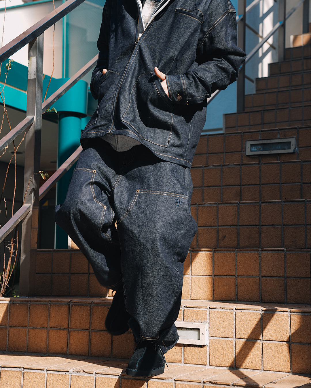 育てるデニム。洗いをかけていないリジットデニムなので経年変化が楽しめます。アタリ、シワ、クセ、時間をかけて自分を刻み込め。絶妙な太さのバギーシルエットで、膝はダブルニー。Vain Zip Shirt “denim”とセットアップで着用可能。